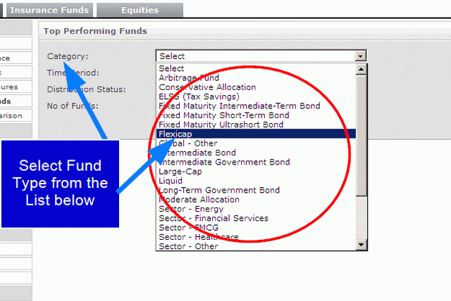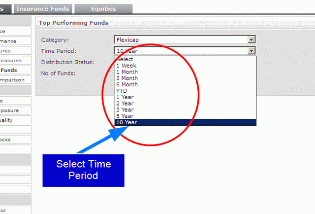 The next panel will have 4 subjects – Category, Time Period, Distribution Status and No. of Funds. First click on the drop down list for ‘Category’ and select the type of fund in which you are interested. In the image below, the ‘Category’ selected is ‘Flexicap’. You can select any type of Category depending upon your risk appetite.