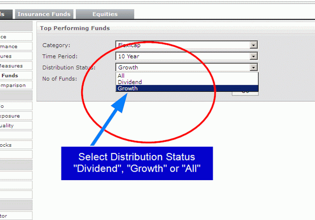 Now click on the drop down list for ‘Distribution Status’. The options available are ‘All’, ‘Growth’, and ‘Dividend’. In the image displayed below, the option selected is ‘Growth’.