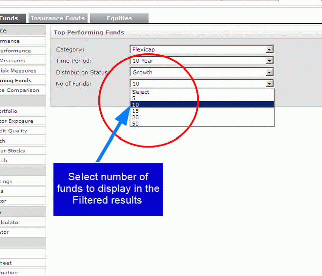 Next, from the drop down list for ‘No. of funds’, select the number of top performing funds for which you would like to view results. The selection available is 5, 10, 15, 20 and 50. In the image below, the option selected is 10.