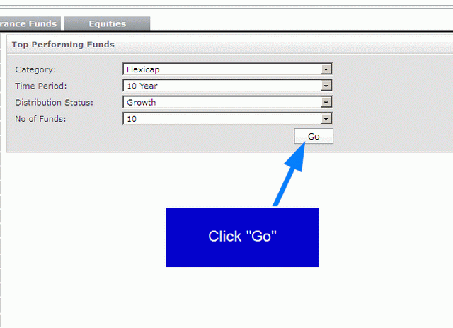 In the next screen, you will see a list of the top 10 performing funds with reference to the category, time period, and distribution status that you have selected. From the images above, you will see that we have searched for the top 10 (number) performing flexicap (category) growth (distribution status) funds for 10 years (time period).