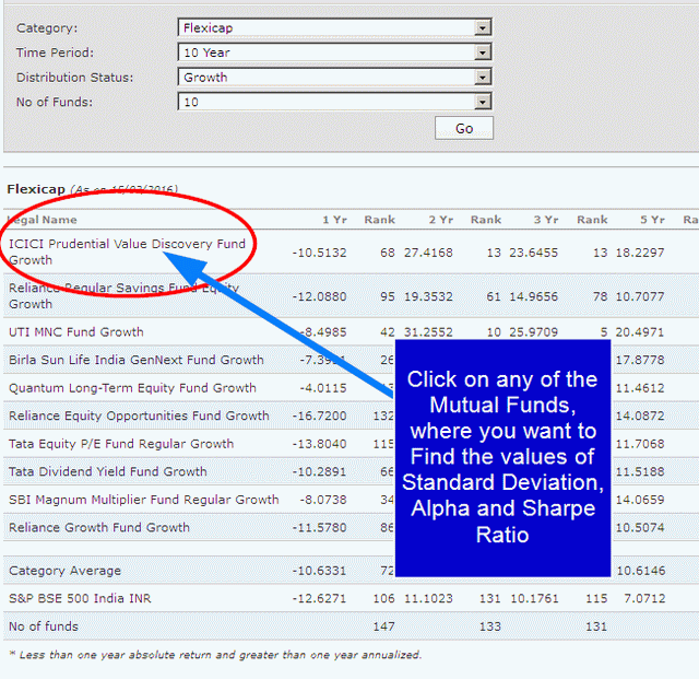 The data displayed is as on date and shows the return and the rank. The top 10 positions are with reference to the current date. Now point the cursor at the particular fund for which you would like to view the Alpha, Beta, Standard Deviation and Sharpe Ratio and click. In the screen shot below, the fund selected for display of such data is the ICICI Prudential Value Discovery Fund Growth.