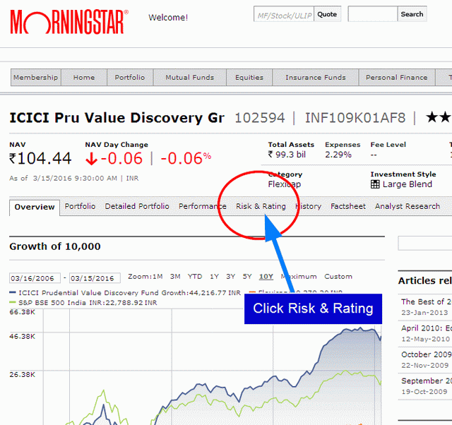 The next screen will display all the data related to the fund that has been selected; the ICICI Prudential Value Discovery Fund Growth. Click on the ‘Risk and Rating’ button in the bar as demonstrated in the image below.
