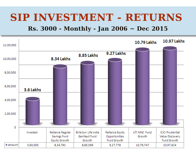 If you had invested Rs.3,000/-per month for 10 years from January 1, 2006 to December 31,, 2015, through SIP in the schemes that we tabulated earlier, this is what your results would have been. The aggregate amount you would have invested would have been Rs.3,60,000/-